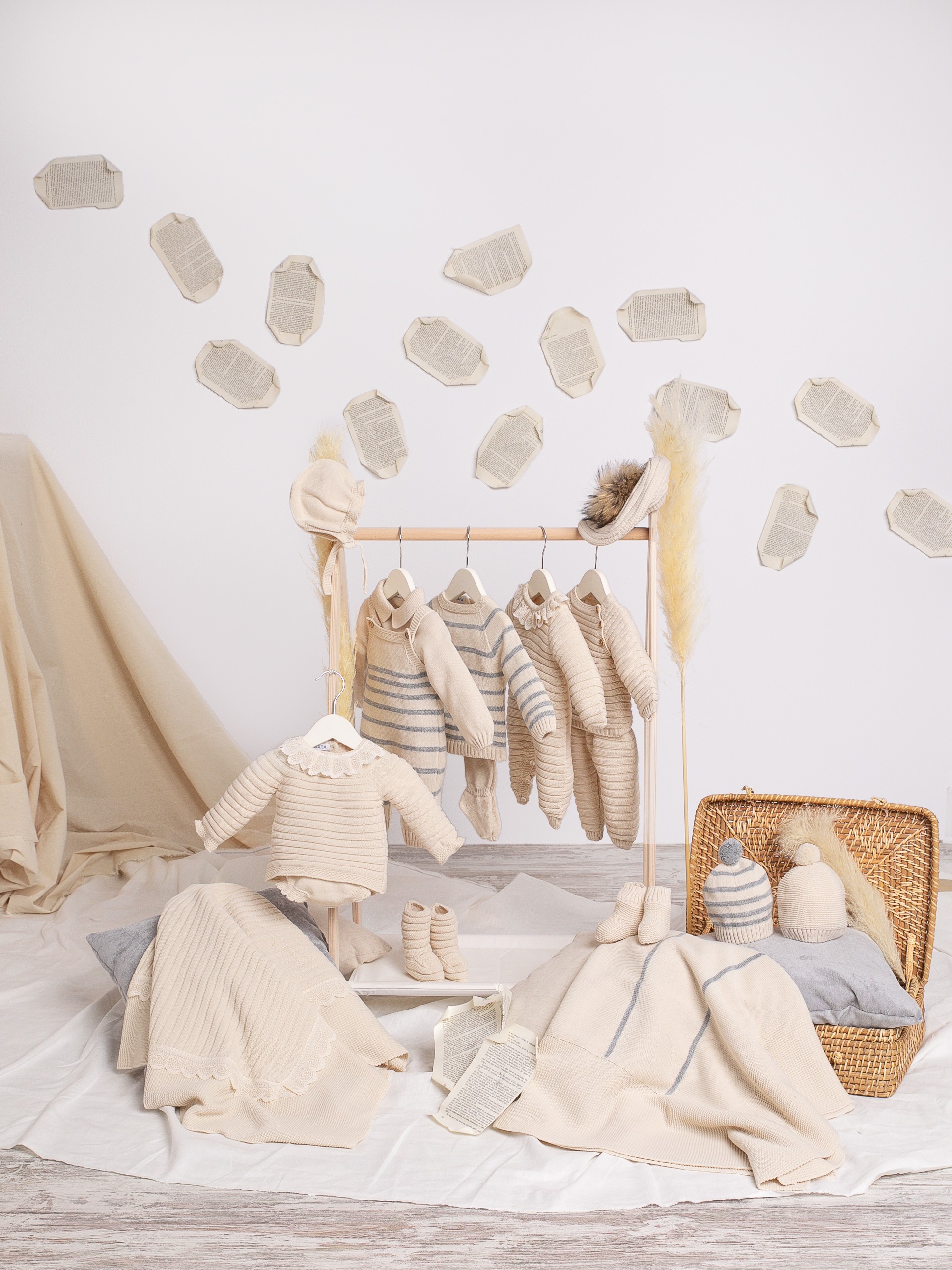 Colección de Juliana en tonos crema y gris. Disponible hasta talla 48 meses.